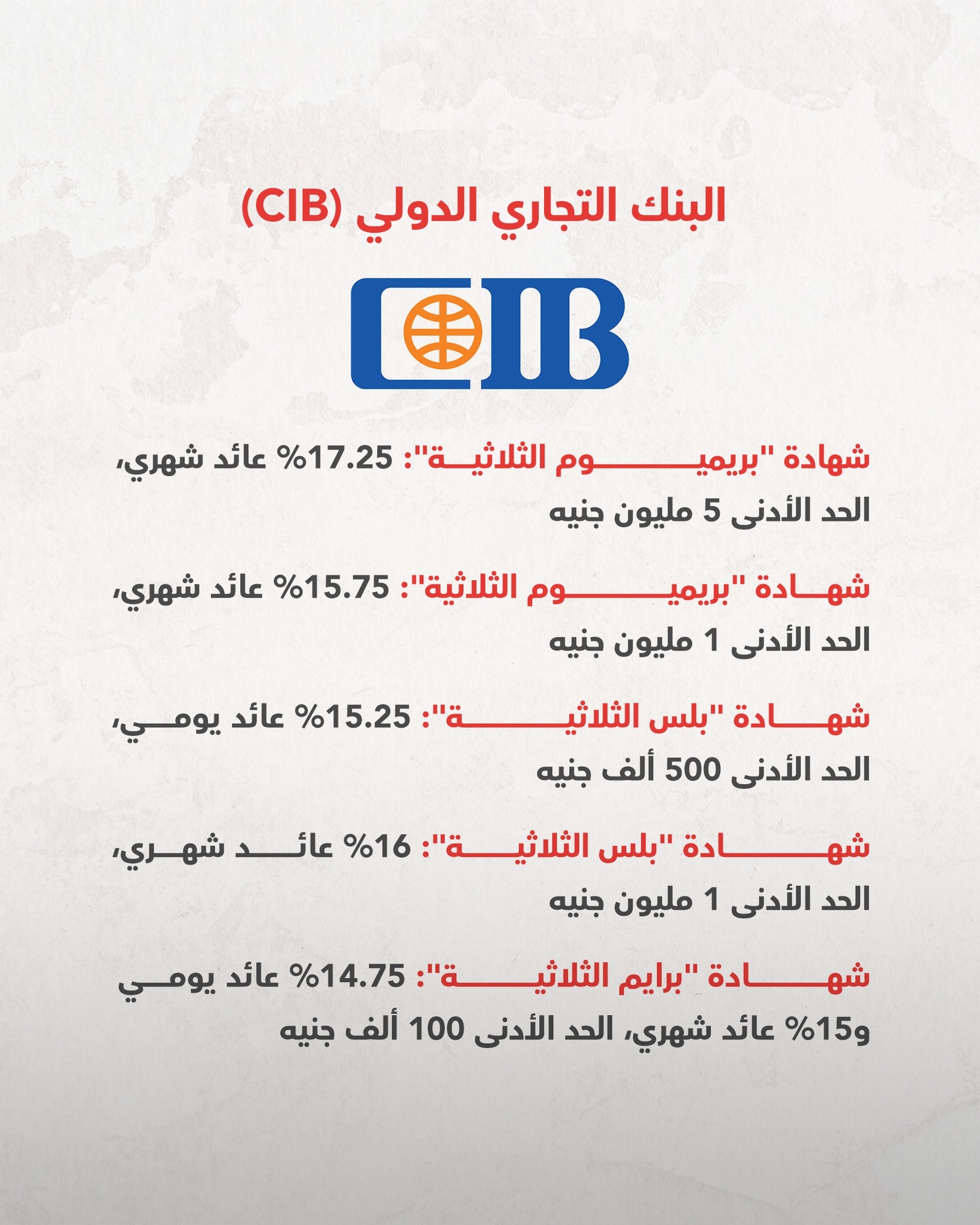 وأوضح البنك التجاري الدولي CIB، أن شهادة بريميم الثلاثية تقدم عائدًا شهريًا بنسبة 17.25%، بحد أدنى للشراء 5 ملايين جنيه.